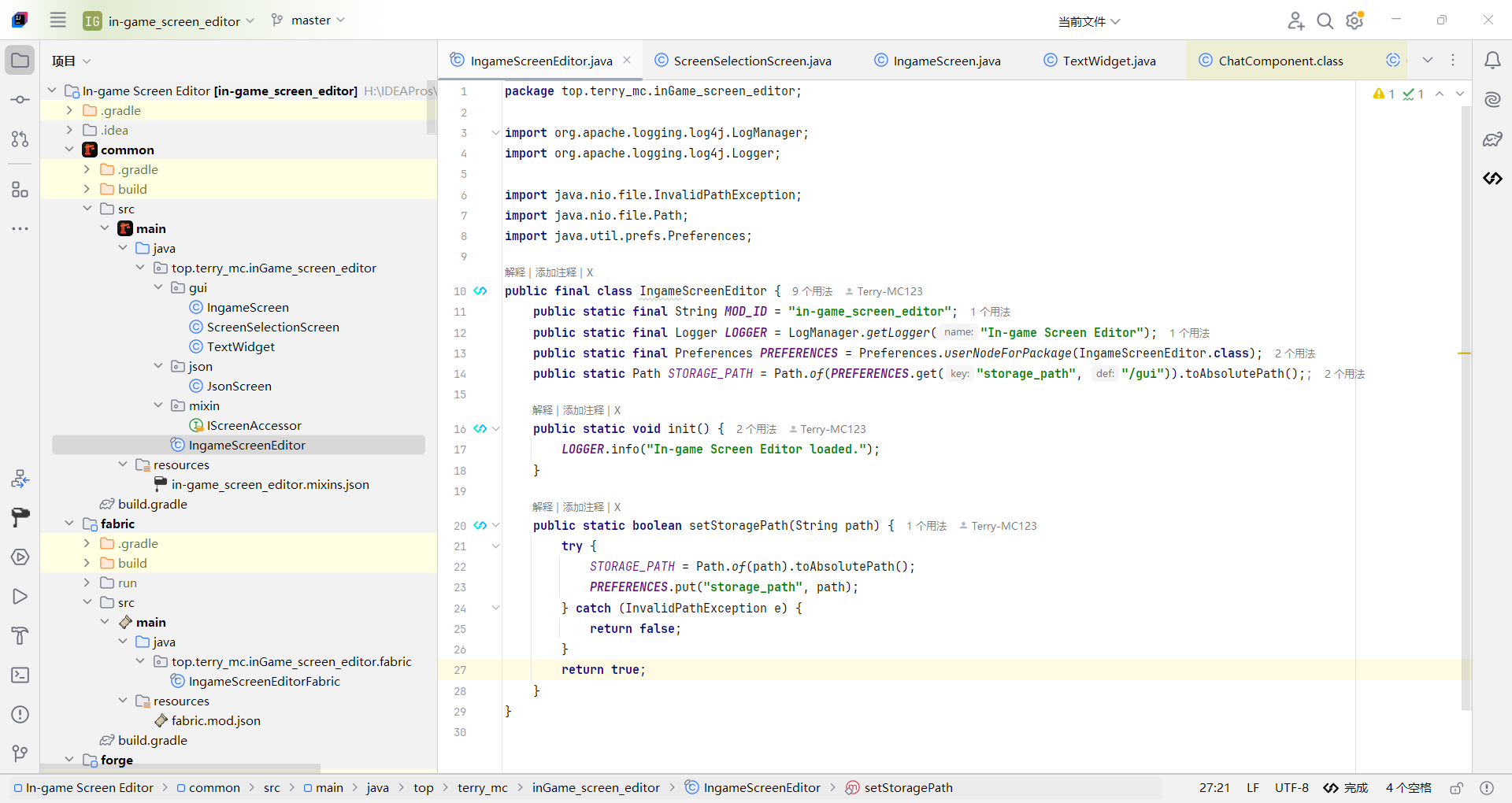 今天把动态加载Screen的父Screen类、TextWidget、编辑选择Screen(没写完)和Json加载目录和读取写了写,后面有更新会写随笔的!也可以看GitHub仓库的commits(虽然现在只有一个commit)。